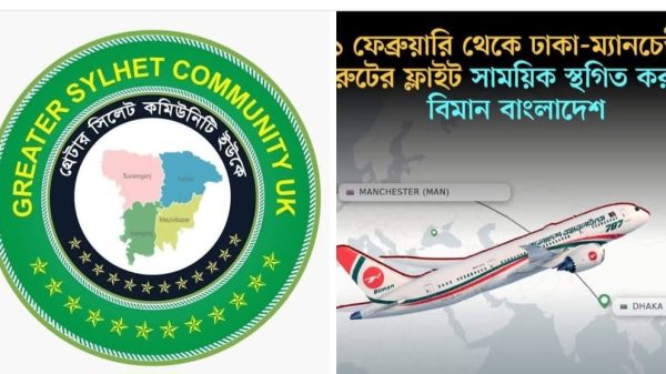 বিমান বাংলাদেশ কর্তৃপক্ষ আগামী ১ লা ফেব্রুয়ারী ২০২৬ থেকে পরবর্তী নির্দেশনা না দেয়া পর্যন্ত বিমানের ম্যানচেষ্টার টু সিলেট ফ্লাইট সাময়িক বন্ধ রাখার যে নির্দেশনা দেয়া হয়েছে তা প্রবাসীদের মধ্যে হতাশা ও ক্ষোভ বিরাজ করছে বলে উল্লেখ করে গ্রেটার সিলেট কমিউনিটি ইউকের কেন্দ্রীয় কনভেনর ও ইউকে বিডি টিভির চেয়ারম্যান কমিউনিটি ব্যাক্তিত্ব মোহাম্মদ মকিস মনসুর বলেন, বিমান কর্তৃপক্ষ উড়োজাহাজের সল্পতা ,আসন্ন হজ্ব কার্যক্রম পরিচালনা ও বিমানের রক্ষনাবেক্ষনে অযুহাত দেখিয়ে তাহা বন্ধ করার সিদ্ধান্ত আত্মঘাতী বলে মনে করেন। তিনি এর তীব্র প্রতিবাদ ও নিন্দা জানিয়ে অবিলম্বে এই ফ্লাইট চালুর যথাযথ পদক্ষেপ গ্রহণের জোর দাবি জানিয়েছেন।